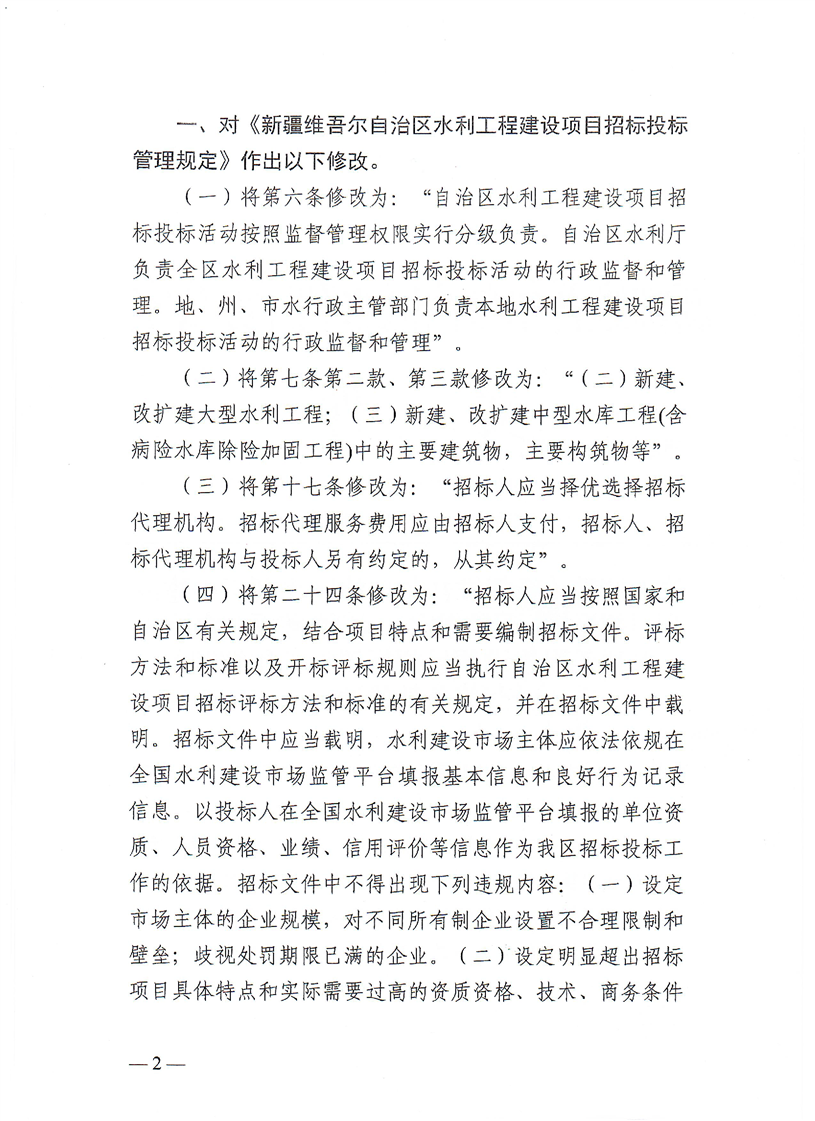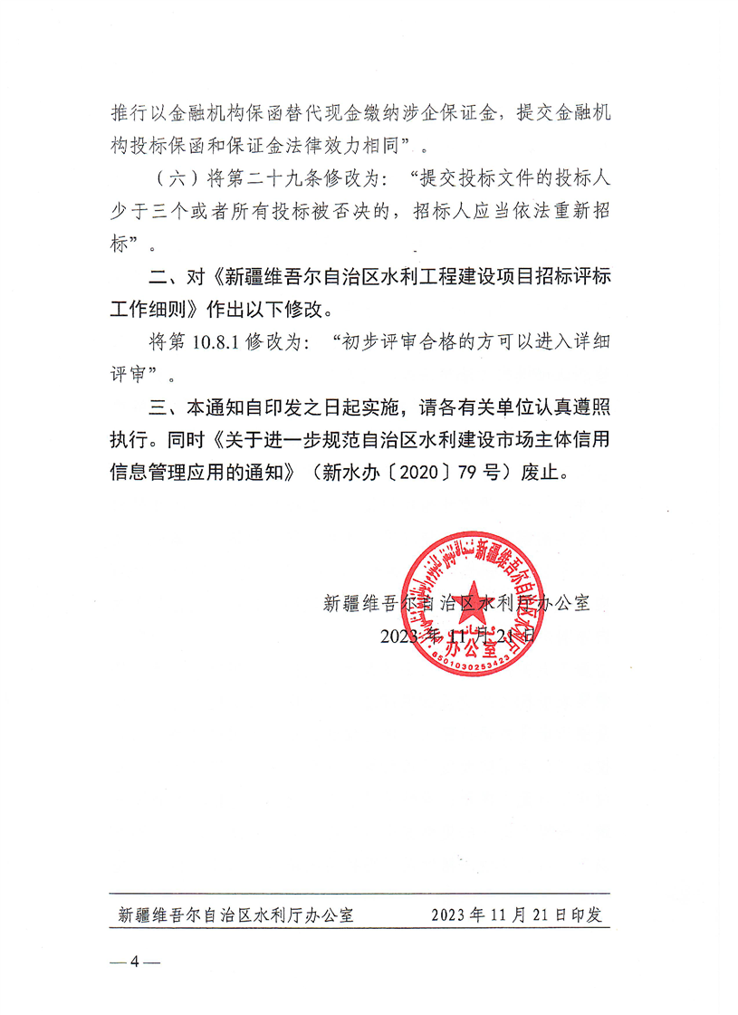 2023年关于调整《新疆维吾尔自治区水利工程建设项目招标投标管理规定》《新疆维吾尔自治区水利工程建设项目招标评标工作细则》有关条款的通知