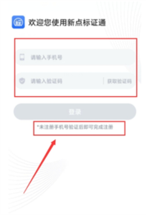 初次使用新点标证通的用户,打开APP后输入手机号,点击【获取验证码】,输入正确的验证码,验证成功后即可完成注册,登录新点标证通。如图: