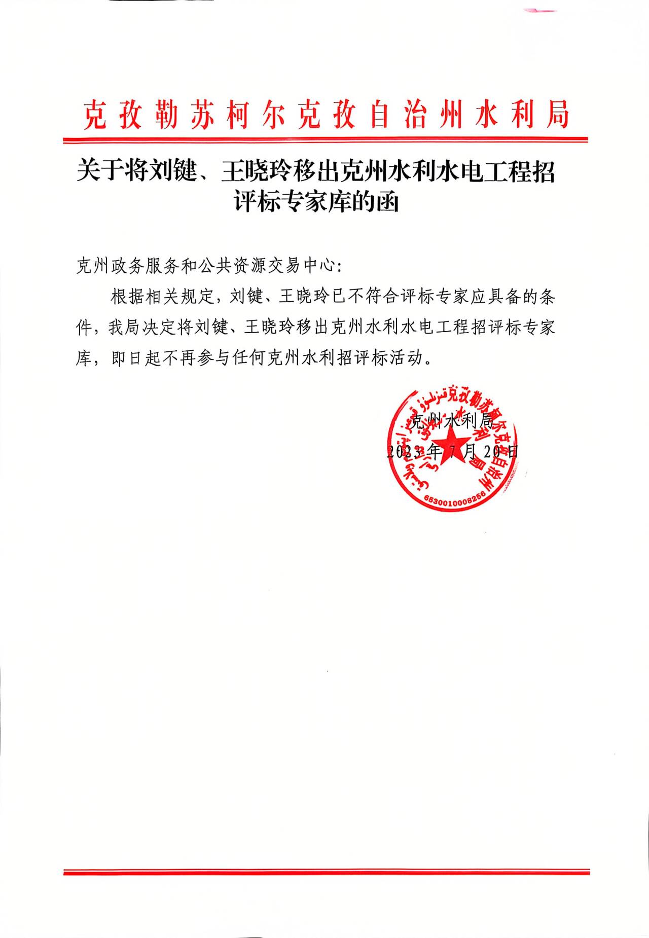 关于将刘键、王晓玲移除克州水利水电工程招标评标专家库的函